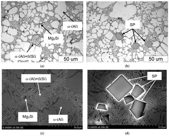 Microstructure of the AlSi7Mg alloy: (a,c) alloy no. 1 (without sludge particles); (b,d) alloy no. 11 (presence of sludge particles); (a,b) LM; (c,d) SEM.