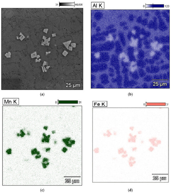 From the microstructure identification and the authors’ own research [44], it follows that in the AlSi7Mg alloy, besides structural constituents—such as α(Al) dendrites; β(Si) crystals (part of the α(Al)+β(Si) eutectic); and the Mg2Si phase—part of the α(Al)+Mg2Si+β(Si) eutectic, the α-Al15(Fe;Mn)3Si2 phase, scarce precipitates of the β-Al5FeSi (β-Fe) and α-Al13(Fe;Cr)4Si4 [45] phases, and sludge particles were identified. From the microstructures presented in Figure 4, it follows that if SF < 1.5%, the microstructure of the AlSi7Mg alloy with an elevated share of iron and manganese is correct, and the (β-Fe) phases have been replaced by α-Al15(Fe;Mn)3Si2 with a typical dendritic structure. Increasing the SF from 1.5 to approx. 2.0% causes the appearance of scarce β-Fe precipitates, and the arms of the α-Al15(Fe;Mn)3Si2 phase become “thicker” (Figure 4b). If the sludge factor exceeds approx. 2.0%, then in the structure of the tested alloy, besides β-Fe and α-Al15(Fe;Mn)3Si2 phase precipitates, individual, “blocky” precipitates of sludge particles appear (Figure 4c). The microstructure of the AlSi7Mg alloy without sludge particles and with sludge particles is shown in Figure 5, and the surface distribution of aluminium, manganese, and iron in the sludge particles is shown in Figure 6.
