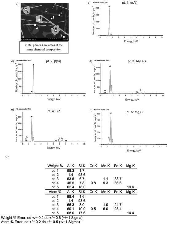 Microstructure (SEM) of the AlSi7Mg alloy containing sludge particles (a) and results of microanalysis of the chemical composition: (b) α(Al) dendrites, (c) β(Si) crystals, (d) Al5FeSi phase, (e) sludge particles, (f) Mg2Si phase, (g) element content at the investigated points.