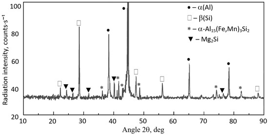 To identify the structural constituents and intermetallic phases revealed in the microstructure of the AlSi7Mg alloy after introducing the Al-Mn master alloy, XRD investigations were carried out. The X-ray diffraction results are presented in Figure 8.