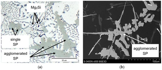 Microstructure (a) LM and (b) SEM of the AlSi7Mg alloy showing the varying morphology of sludge particles: (a) magnification 1000×; (b) magnification 500×.