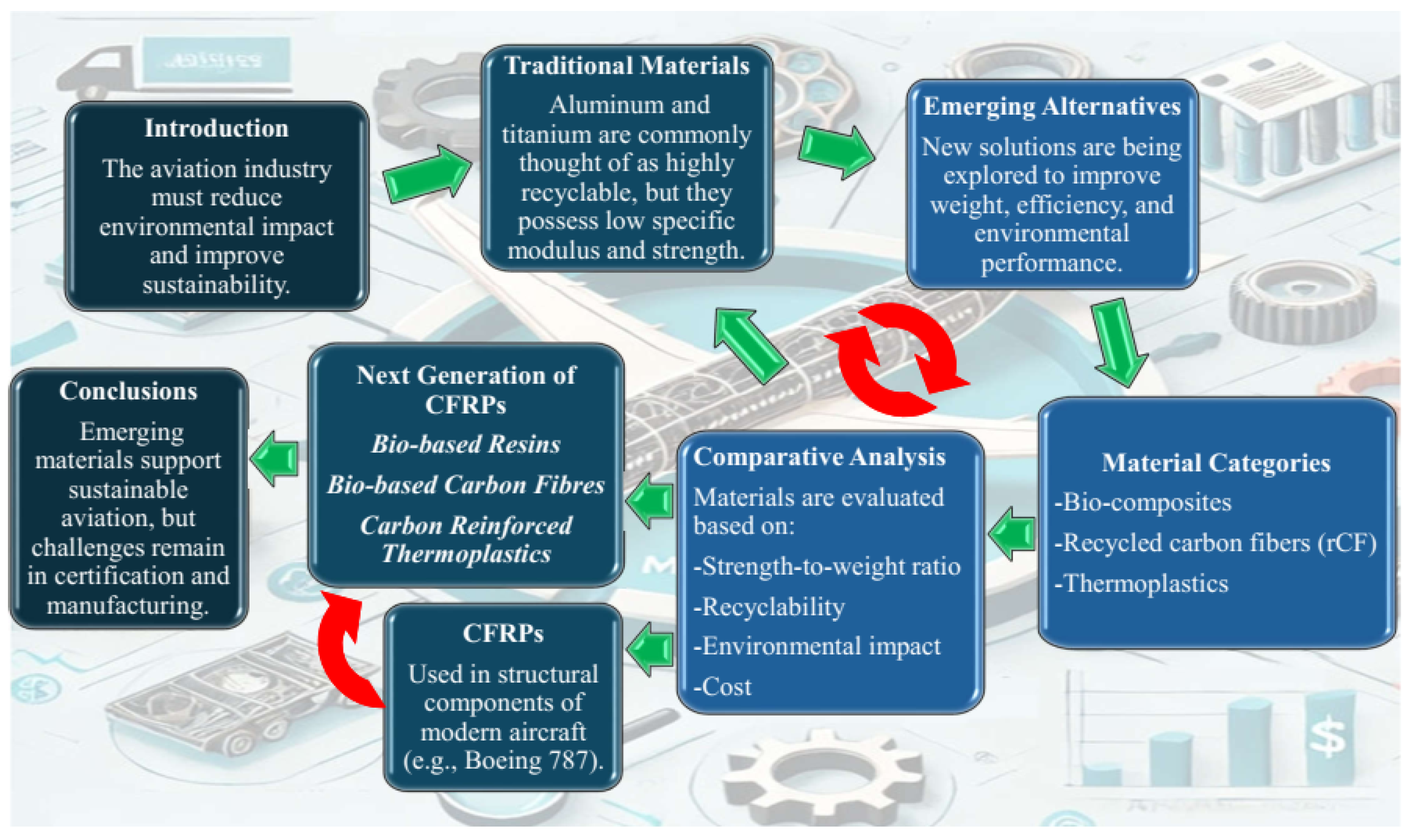 A literature survey was conducted using Scopus, ScienceDirect, and Google Scholar databases. The guidelines of this review attempt to answer the following question: What new, emerging material solutions have been studied to replace traditional materials like aluminum and titanium alloys, or the not-so-old polymer-based, reinforced polymers using carbon and glass fibers? These are interrelated with the quest for improved efficiency, sustainability, recyclability, and reduction of greenhouse gas emissions.