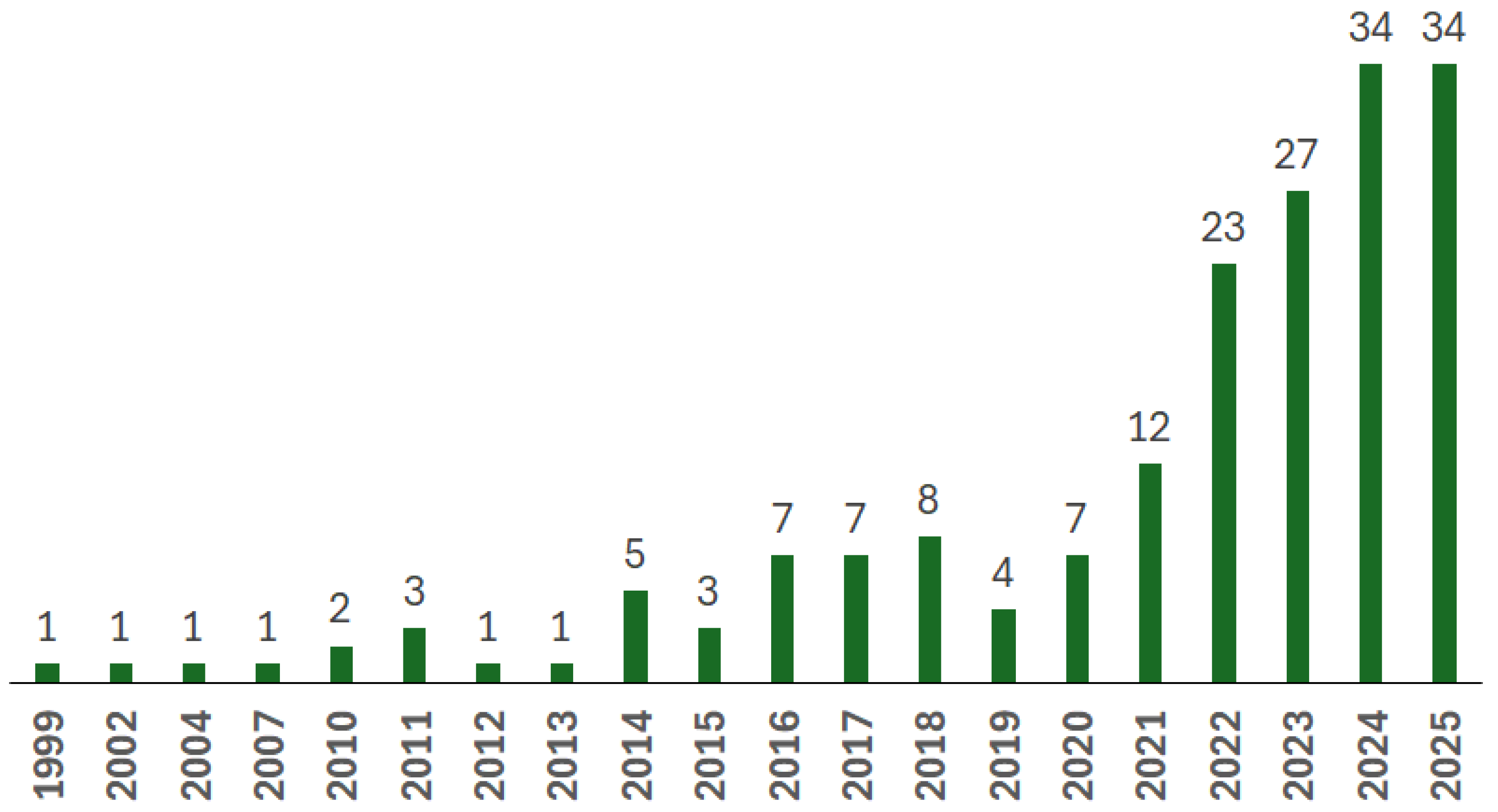 Figure 3 illustrates the evolution of publications on recycled carbon fibres in the aerospace and aviation sectors. These articles have either been published in journals or presented at conferences. Growth in publicly available research in this field is moderate. The limited number of publications may be related to the fact that current solutions cannot produce recycled fibres that meet the requirements of the aerospace industry.
