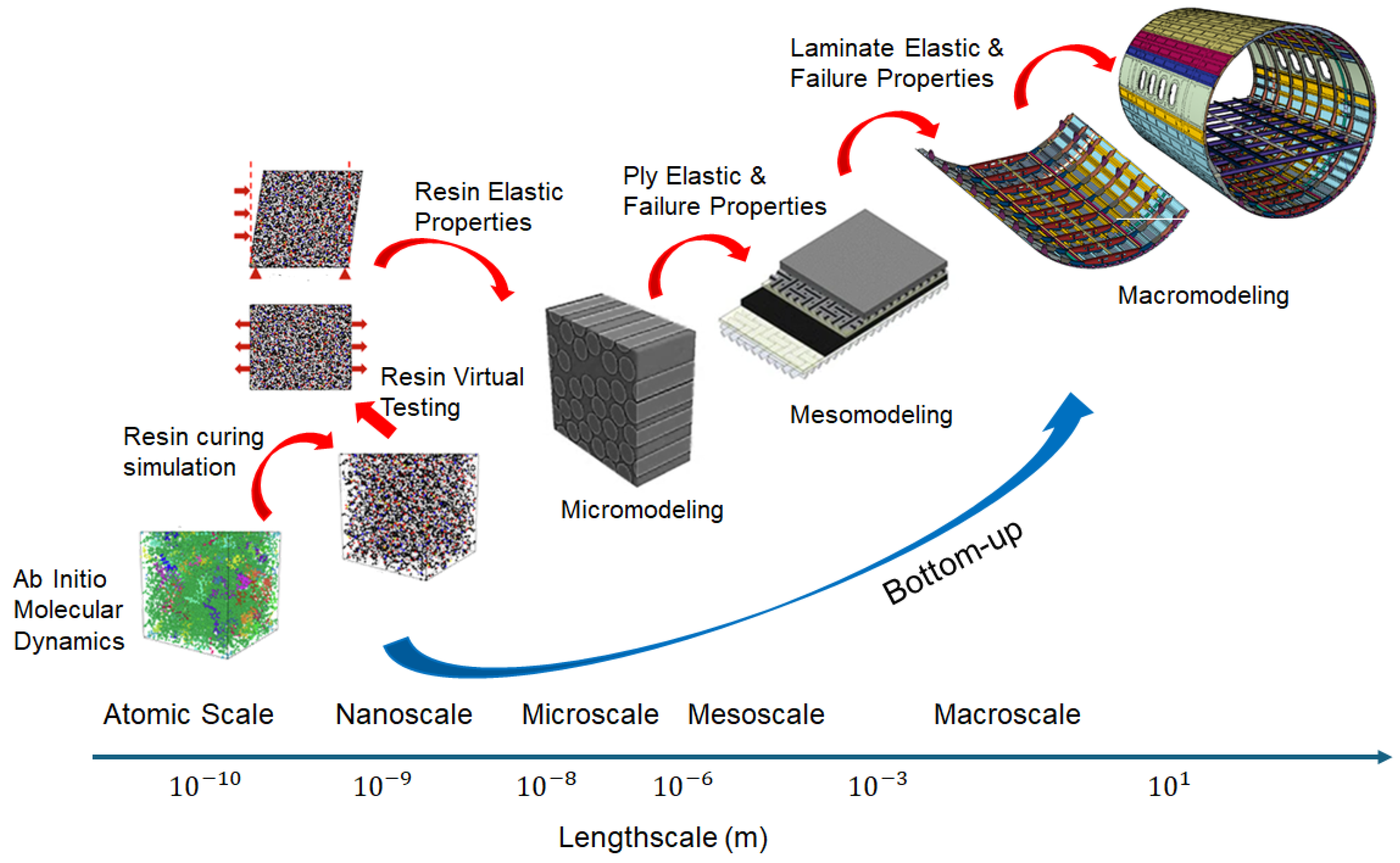 64]. Recently, two additional levels were added at the bottom of the scale to start from the resin-matrix design. Starting with the atomic scale, a quantum-chemical reaction path is used to calculate the reaction characteristics of epoxy curing. Then, molecular dynamics simulations are used to determine epoxy properties at the molecular scale [