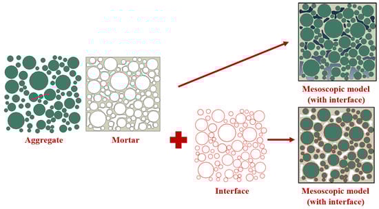 The original aggregate particles were divided from the inside out into two parts, that is, aggregate and interface, so as to construct the Mesoscopic models with aggregate–mortar interfaces. Considering the distribution of free and structural asphalt, the interface thickness of 0.1 mm was decided, and a four-phase composite model including the aggregate, mortar, interface, and voids was obtained. The Mesoscopic models with and without the interface are shown in Figure 1.