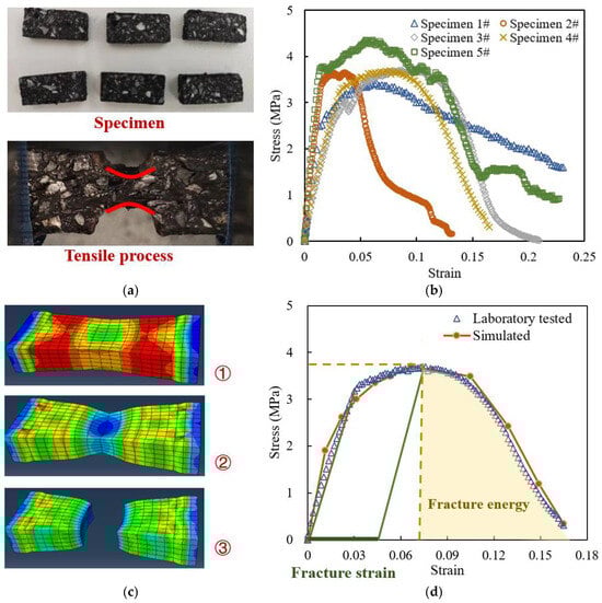 The elastic constitutive parameters of high viscosity asphalt mortar were selected from the data at 20 °C and 10 Hz loading, with a modulus of 3500 MPa and Poisson’s ratio of 0.35 [27,28]. The tensile test was conducted to test the true stress–true strain curves of asphalt mortar, so as to calculate the plastic constitutive parameters. The Ductile damage model was applied, and the fracture strain was the plastic strain value corresponding to the stress peak on the stress–strain curve. The smaller the value, the earlier the material begins to suffer damage. Fracture energy is determined by integrating the descending phase of the curve, and the larger the value, the longer the damage development stage of the material and the better its ductility [29,30].