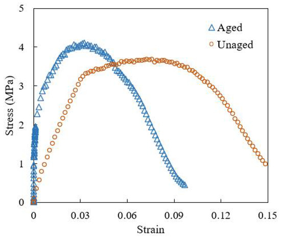 According to the accelerated aging method in the T0734 section of the Chinese standard of JTG E20-2011 [22], the high viscosity asphalt mortar prepared in Section 2.3 was placed in an 85 °C oven for 1 day, so as to prepare the aged specimens. As in Section 2.3, the tensile curves of the aged and unaged specimens were tested, as shown in Figure 4. The calculated fracture strain after aging was 0.0242, and the fracture energy was 4.715 kJ/m2. On this basis, five sets of parameters to were determined to characterize different aging stages of mortar, as shown in Table 4.