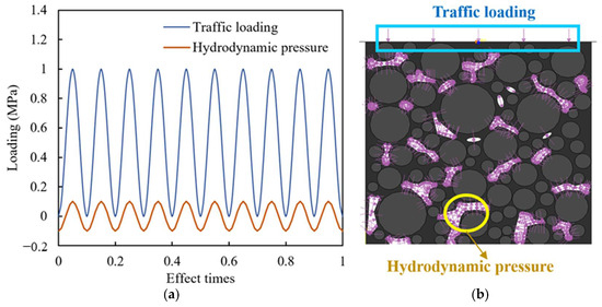 When there is a large amount of precipitation, the voids in the mixture are completely filled with water. If a vehicle load passes through at this time, the impact of the dynamic water pressure on the mixture is the strongest. The dynamic water pressure at this time can be simulated using a simply harmonic wave. Therefore, considering this extreme situation, a 10 Hz semi vector function load was applied at the top of the model to simulate the traffic load. When the vehicle comes in and leaves, it squeezes water into the voids or draws water from it, forming positive and negative hydrodynamic pressure, respectively. Affected by factors such as vehicle speed and pavement moisture content, the internal hydrodynamic pressure of the asphalt pavement ranges from 0.1 MPa to 0.5 MPa [5,36,37]. The hydrodynamic pressure is in phase with the traffic load, that is, when the traffic load reaches its maximum and minimum values, the hydrodynamic pressure inside the voids also reaches the maximum positive and negative values, respectively, as shown in Figure 5a. The direction of hydrodynamic pressure application is normal to the surface of the void, as shown in Figure 5b. To figure out the coupling effect of traffic loading and hydrodynamic pressure, the hydrodynamic pressure and traffic load were first applied together 1500 times, and then the traffic load was applied separately 500 times.