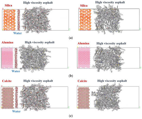 When there is no obvious destruction in the drainage asphalt mixture, water only exists in its void structure. However, when it is severely destructed, water enters the interface between the aggregate and mortar through cracks in the mortar, exacerbating the attenuation of interfacial adhesion. To investigate the molecular mechanism of the water influence on the interface, interface molecular models with or without water were both constructed, as shown in Figure 6.