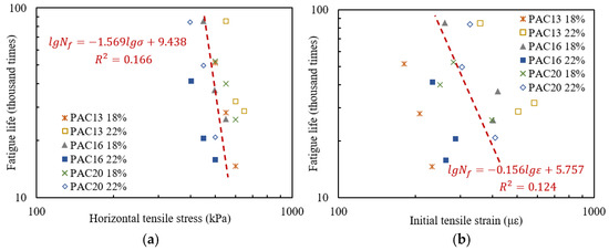Correspondence between fatigue life and stress or strain of drainage asphalt mixture specimens: (a) horizontal tensile stress; (b) initial tensile strain.