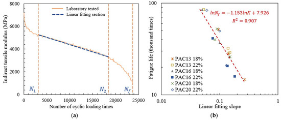 Fatigue life modeling based on indirect tensile modulus: (a) fitting of linear fitting slope; (b) relationship between fatigue life and linear fitting slope.