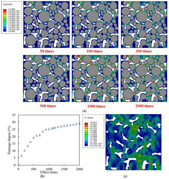Figure 9a shows the damage distribution of the mortar under different numbers of traffic loading time at 0.7 MPa and 10 Hz. The completely blank area is the void, the white grid area is the aggregate without damage, and the other areas are asphalt mortar. The damage degree curve under load is plotted in Figure 9b. Mises stress is the combination of tensile compressive stress and shear stress, which can reflect the internal stress distribution of the mortar, as shown in Figure 9c. It can be seen that the damage initially occurs in the area close to the load at the top of the model, and the area with better interlocking effect between aggregates has a higher stress level compared with other areas, thus transmitting the force chain. The mortar area on the force chain transmission path between adjacent aggregates is most severely damaged, while the damage in the mortar area outside the force chain is relatively small, and the damage development in the upper area of the model is faster than that in the middle and lower areas. When the load is applied for 500 times, the mortar damage accumulates rapidly, then the damage accumulation gradually slows down, and the damage degree eventually stabilizes at around 31%.