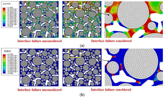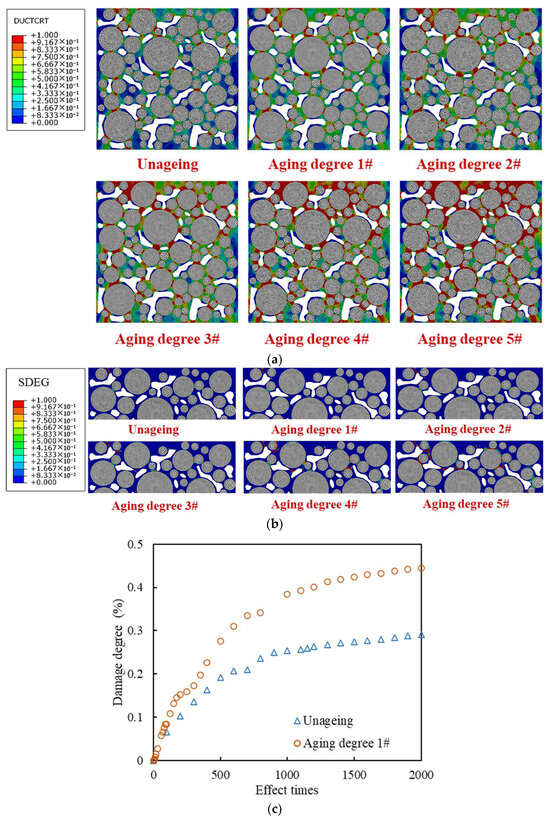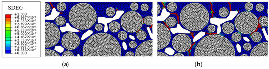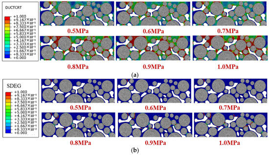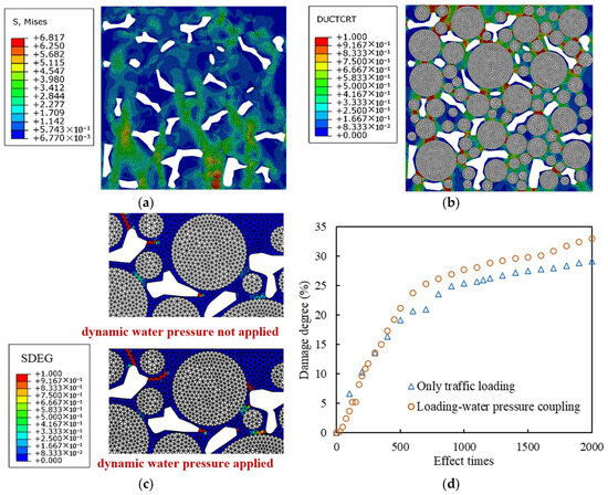 The mesoscopic PAC13 models constructed in Section 2.3 were applied in the following simulations. The mesoscopic model without an interface was applied first. “Ductile damage initiation criterion” (DUCTCRT) index and “segment degradation” (SDEG) index are applied to quantify the results of the color map obtained from the mesoscopic simulation.