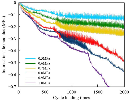 The indirect tensile modulus of the specimen was calculated according to Equation (3), where was the peak horizontal elastic deformation of the specimen during a single loading, and μ was Poisson’s ratio [24].