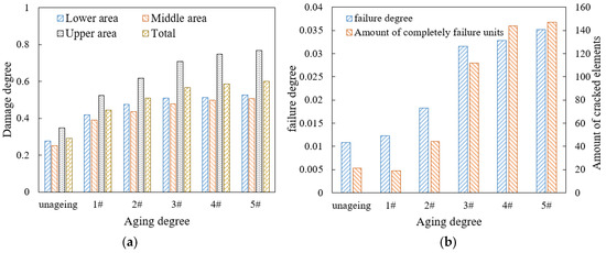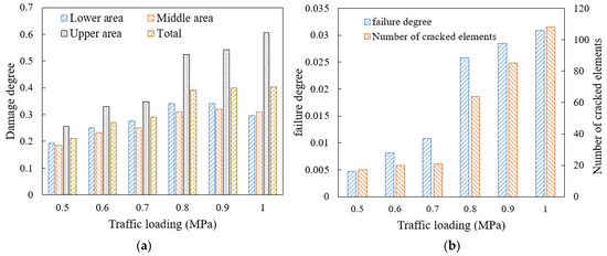 Damage and failure situation of mortar under different traffic loading levels: (a) damage degree; (b) failure degree and amount of cracked elements.