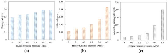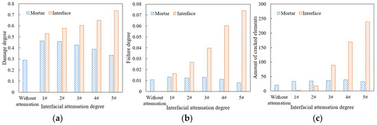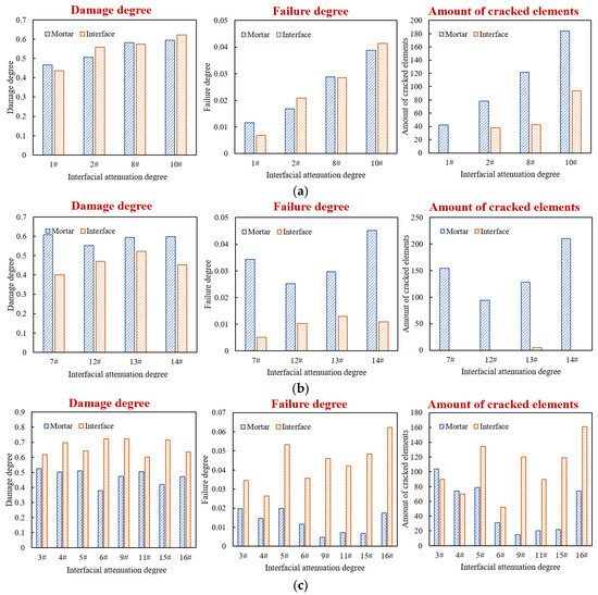 The damage degree, failure degree, and number of cracked elements of mortar and interface under each combination were calculated, as shown in Figure 21.