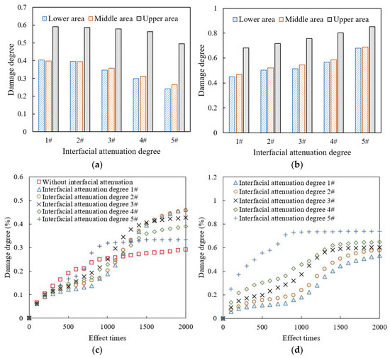 Accordingly, the 16 factor combinations can be divided into three groups. Group I includes combinations 1#, 2#, 8#, and 10#; the differences in the damage degree of interface and mortar are within 5%, corresponding to the general adhesion state between asphalt and aggregate in actual drainage pavement. Group II includes combinations 7#, 12#, 13#, and 14#; the interface damage degree is lower than that of mortar, and the differences are greater than 7%, corresponding to the good adhesion state between asphalt and aggregate in actual drainage pavement. In Group III, the interface damage degree is greater than that of mortar, corresponding to situations where the adhesion between asphalt and aggregate is poor or the interface water damage is severe in actual drainage pavement. For combinations 3#, 4#, 5#, and 11#, the damage degree differences are less than 20%, while for combinations 6#, 9#, 15#, and 16#, the differences are more than 20%. The damage and failure distribution of each model are shown in Figure 22.