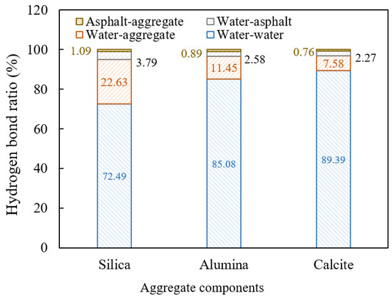 As shown in Figure 23, water–water hydrogen bonds account for the vast majority of the total interface hydrogen bonds in a water containing environment, followed by water–aggregate and water–asphalt hydrogen bonds, and the asphalt–aggregate hydrogen bonds only account for about 1%. It indicates that the aggregate significantly tends to form hydrogen bonds with water rather than asphalt, thus attenuating the interfacial adhesion. For the interface between the asphalt and aggregate, the asphalt–aggregate hydrogen bonds are conducive to the adhesion of the interface, while the water–aggregate and water–asphalt hydrogen bonds promote the stripping of the interface. In this regard, the “interface hydrogen bond ratio (IHR)” indicator was proposed, which is defined as the ratio of the sum of water–aggregate and water–asphalt hydrogen bonds to the asphalt–aggregate hydrogen bonds. The greater the HIR value, the greater the promotion effect of hydrogen bond on interface stripping. According to the data in Figure 23, the IHR indicators of the interface between high viscosity asphalt and silica, alumina, and calcite aggregate components were calculated to be 24.24, 15.76, and 9.83, respectively. It can be seen that the IHR indicator between high viscosity asphalt and silica is much higher than that with alumina or calcite aggregate components, indicating that silica, as an acidic aggregate component, has obvious hydrophilicity and is not conducive to the adhesion of high viscosity asphalt.