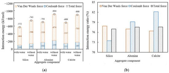 The interaction energy values between high viscosity asphalt and three aggregate components, namely silica, alumina, and calcite were calculated. Due to the mutual attraction between asphalt and aggregate, their interaction energy values are all negative, as shown in Figure 24a. The larger the absolute value of the interaction energy, the better the adhesion state between high viscosity asphalt and aggregate. The ratios of the interaction energy values in water-containing and non-water-containing conditions are shown in Figure 24b. The smaller the ratio, the poorer the water damage resistance of interface.