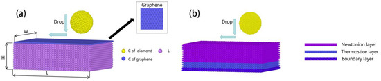 In order to investigate the mechanical response and transport properties of graphene-covered lithium-metal anode interfaces, molecular dynamics simulations were performed in this paper using LAMMPS (2021) [14] software. The size of the simulated system is 151.62 Å × 101.08 Å × 48 Å, which contains a lithium metal matrix, a graphene-covered layer and a diamond probe. The lithium metal matrix has a body-centered cubic (BCC) structure with a lattice constant of 3.44 Å. The graphene layer is a single hexagonal lattice with a lattice constant of 2.4768 Å, which is placed on the surface of the lithium metal to construct a composite interface. In this study, two simulated systems were constructed: Figure 1a Lithium-metal interface (Li/C) with surface covered with a single layer of graphene; Figure 1b unmodified pure lithium-metal interface (Li). Among them, the C/Li system was simulated at 293 K, 300 K and 373 K, respectively, to investigate the effect of temperature on the properties of the LI/C interface.