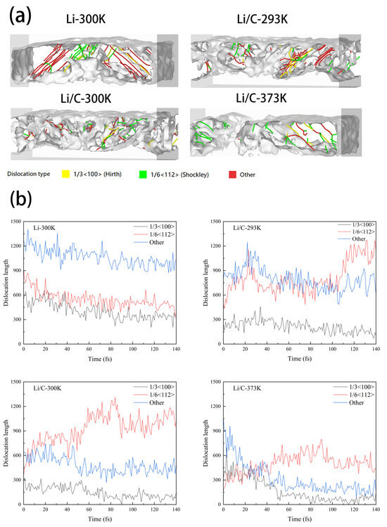 As temperature increases, thermal vibrations in the Li/C system intensify, leading to a pronounced reduction in overall dislocation density. This effect is chiefly ascribed to enhanced atomic mobility at elevated temperatures, which promotes more efficient dislocation annihilation and rearrangement. As a result, defect accumulation is mitigated and the structural order of the matrix is maintained. Concurrently, the spatial distribution of dislocations becomes increasingly diffuse, and the fraction of irregular dislocations further diminishes. These findings suggest that elevated thermal conditions contribute to the suppression of dislocation nucleation and promote the persistence of energetically favorable, regular dislocation structures. This effect is reflected in the achievement of lower dislocation density while maintaining the overall structural integrity of the matrix. Such a result is highly significant for improving and strengthening the overall stability of the matrix material, as well as for increasing the reliability and dependability of interface engineering applications [23].
