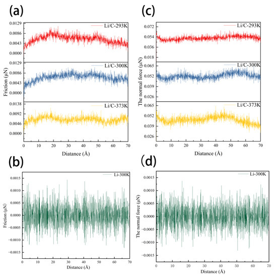 Friction Performance Chart.: (a) Normal force vs. distance curve for Li/C; (b) friction force vs. distance curve for Li/C; (c) normal force vs. distance curve for Li; (d) friction force vs. distance curve for Li.