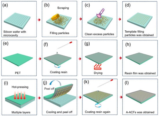 The preparation process of A-ACFs. (a) Blank template; (b) filling particles into the microcavity of the template; (c) cleaning excess particles on the template; (d) microcavity filled with particles; (e) blank polyethylene terephthalate (PET) film as a substrate of the A-ACFs; (f) spin coating polyurethane (PU) resin on PET; (g) drying the PU film; (h) PU film on the PET substrate (PFP); (i) laminating the PFP onto the particle-filled template with heat; (j) peeling off the particles-containing PFP; (k) spin coating another layer of PU on the particle-filled adhesive film; (l) PET carrier with A-ACFs.
