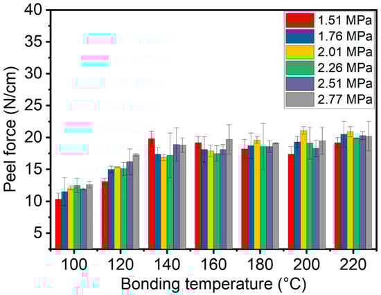 Adhesion was quantified by 180° peel tests on FPC-200 joints using a universal testing machine (Instron 2367) at 5 mm min−1 following ASTM D3330. Each condition was measured five times and averaged to report the peel force (Figure 5). The temperature and pressure dependence of adhesion was analyzed to correlate resin flow/wetting with interfacial strength.