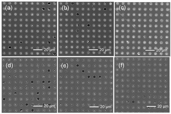 SEM of particle filling in the microcavity at different repeating time. (a) Once for the 4 m depth microcavity; (b) three times for the 4 m depth microcavity; (c) five times for the 4 m depth microcavity; (d) once for the 5 m depth microcavity; (e) three times for the 5 m depth microcavity; (f) five times for the 5 m depth microcavity.