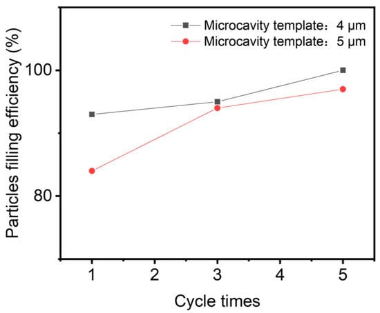 Figure 1a–d demonstrated the process of transferring particles into the template. Excess conductive particles were collected for reuse. For comparison, we prepared two kinds of templates with same diameters and spacing, but with different depths. One is at 4 μm depth; another one is at 5 μm depth. To ensure that each microcavity is filled with one particle, the rubber scraping was repeated three to five times (Figure 6). Figure 7 shows the effect of rubbing cycles on the particle filling percentages. Examination of the microcavities revealed complete filling after five iterative filling cycles (Figure 6). Research has found that there is not much difference in the filling effect between microcavities with 4 μm and 5 μm.