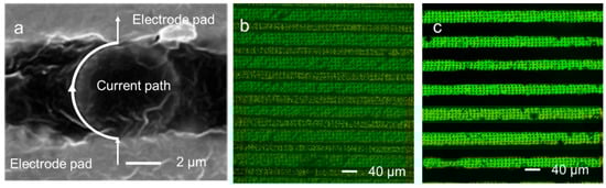 As discussed above the A-ACFs are good interconnection materials for FPC-200. For demonstrating their application, we further use these A-ACFs to bond FPCs with narrower line circuits with a spacing of 40 μm (FPC-40). Using the above optimized bonding condition (160 °C, 2.01 MPa), the connecting resistance and insulation resistance of the two bonded FPC-40s were measured and given in Table S2. The connecting resistance between the two circuits was very small (0.08 Ω) while the insulation resistance remained higher than 200 MΩ (the measurement is given in detail in Figure S1), showing the two interconnected circuits had good connections, while the non-connected circuits has huge electric resistance without electric short circuit, which is required for high-precision connections. Figure 8b,c showed the particles’ distributions on two bonded FPC-40s. Periodic particle alignment was retained for the bonded FPC-40s, which are similar as those of the two bonded FPC-200s.