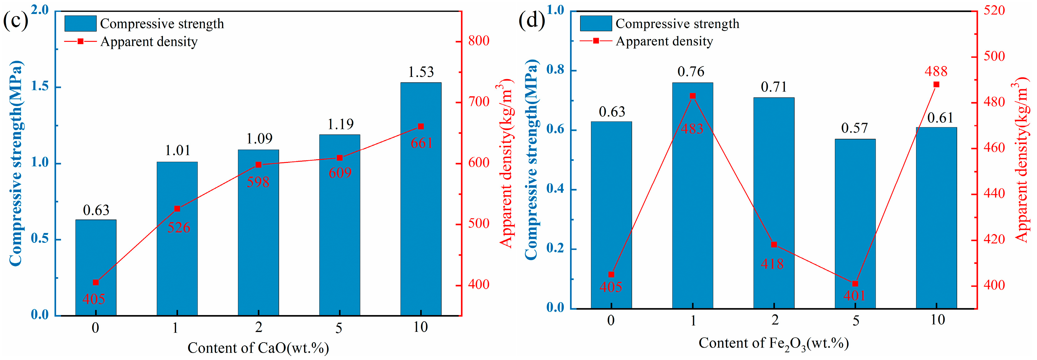 - Performance: Na2O, MgO, and CaO enhanced apparent density/compressive strength and reduced water absorption with higher dosage. 5 wt.% Na2O (Na5) achieved the most significant improvement—apparent density increased by approximately 111% to 854 kg/m3 and compressive strength by approximately 276% to 2.37 MPa compared to the control (405 kg/m3, 0.63 MPa). This superiority stems from the melting-liquid phase effect induced by the alkali flux Na2O, which optimized the pore structure and strengthened the matrix. Fe2O3 exhibited a non-monotonic effect (increase → decrease → recovery): 5 wt.% Fe2O3 caused pore coarsening and interconnection (minimum density 401 kg/m3, strength 0.57 MPa), while 10 wt.% reversed degradation via liquid phase densification, providing guidance for sintering dosage control. All fluxes reduced water absorption, with 5 wt.% Na2O achieving a maximum reduction of 87% (compared to the control sample, 11.79% water absorption).