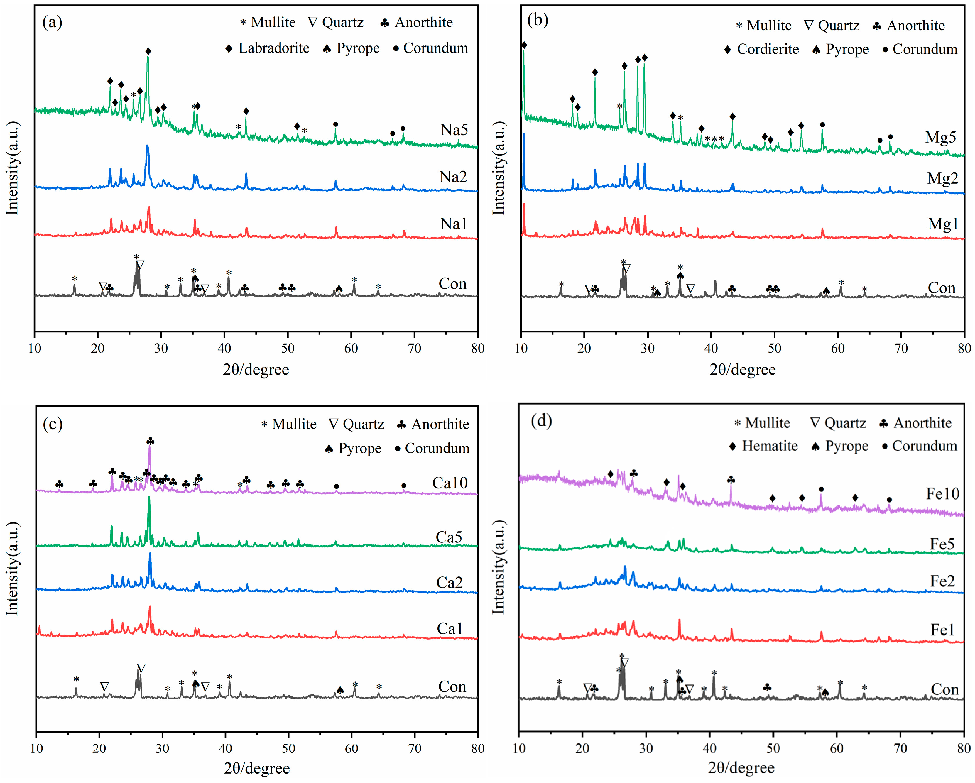 - Mineral evolution: Control ceramsite was dominated by mullite, quartz, anorthite, and pyrope. Corundum emerged in all flux-added samples, attributed to fluxes promoting mullite decomposition—released silicon sources were preferentially consumed in other reactions, leading to aluminum source enrichment and subsequent corundum formation. Specifically, Na2O facilitated labradorite formation, MgO promoted cordierite, and Fe2O3 induced hematite. All fluxes weakened the diffraction peaks of quartz and mullite.