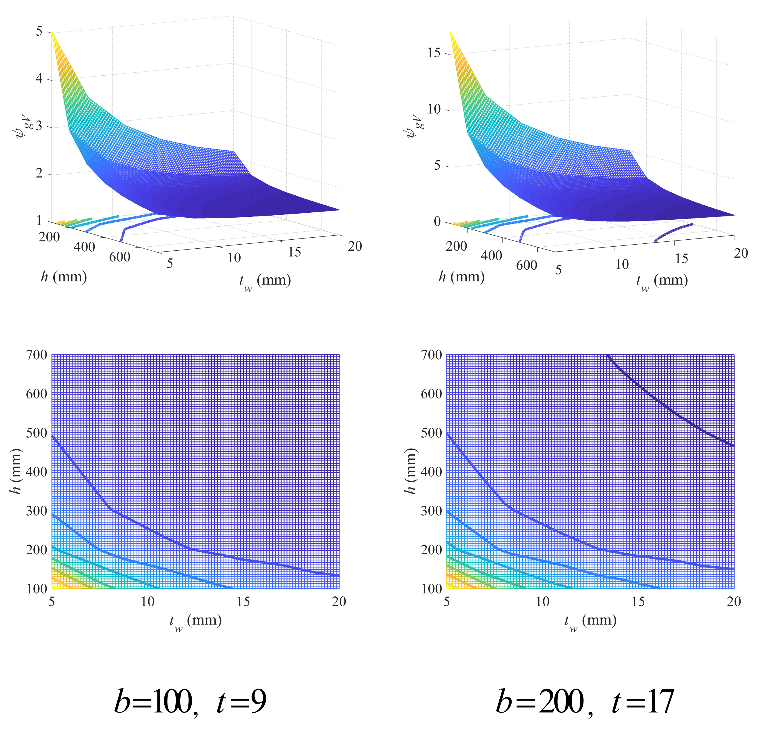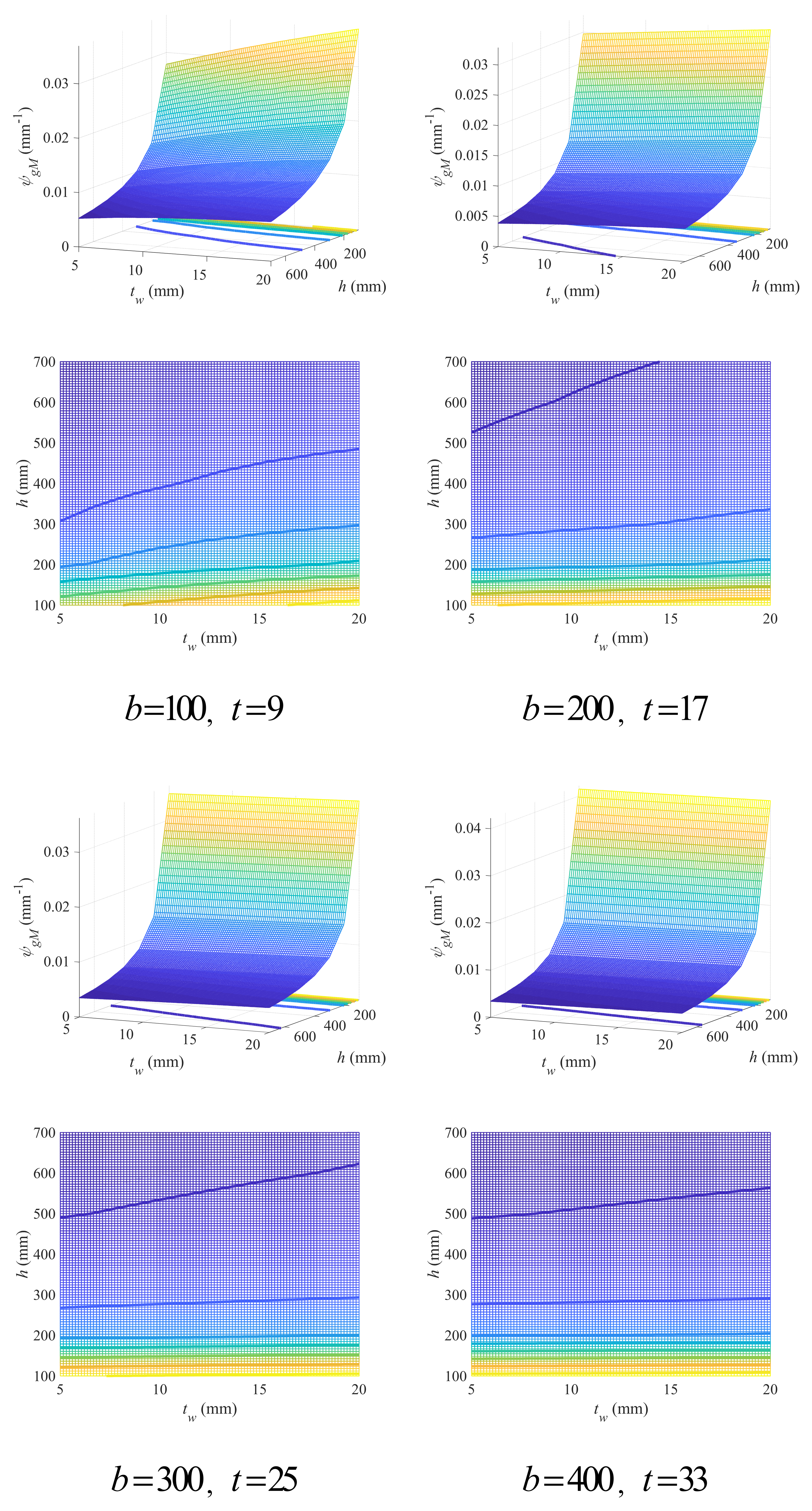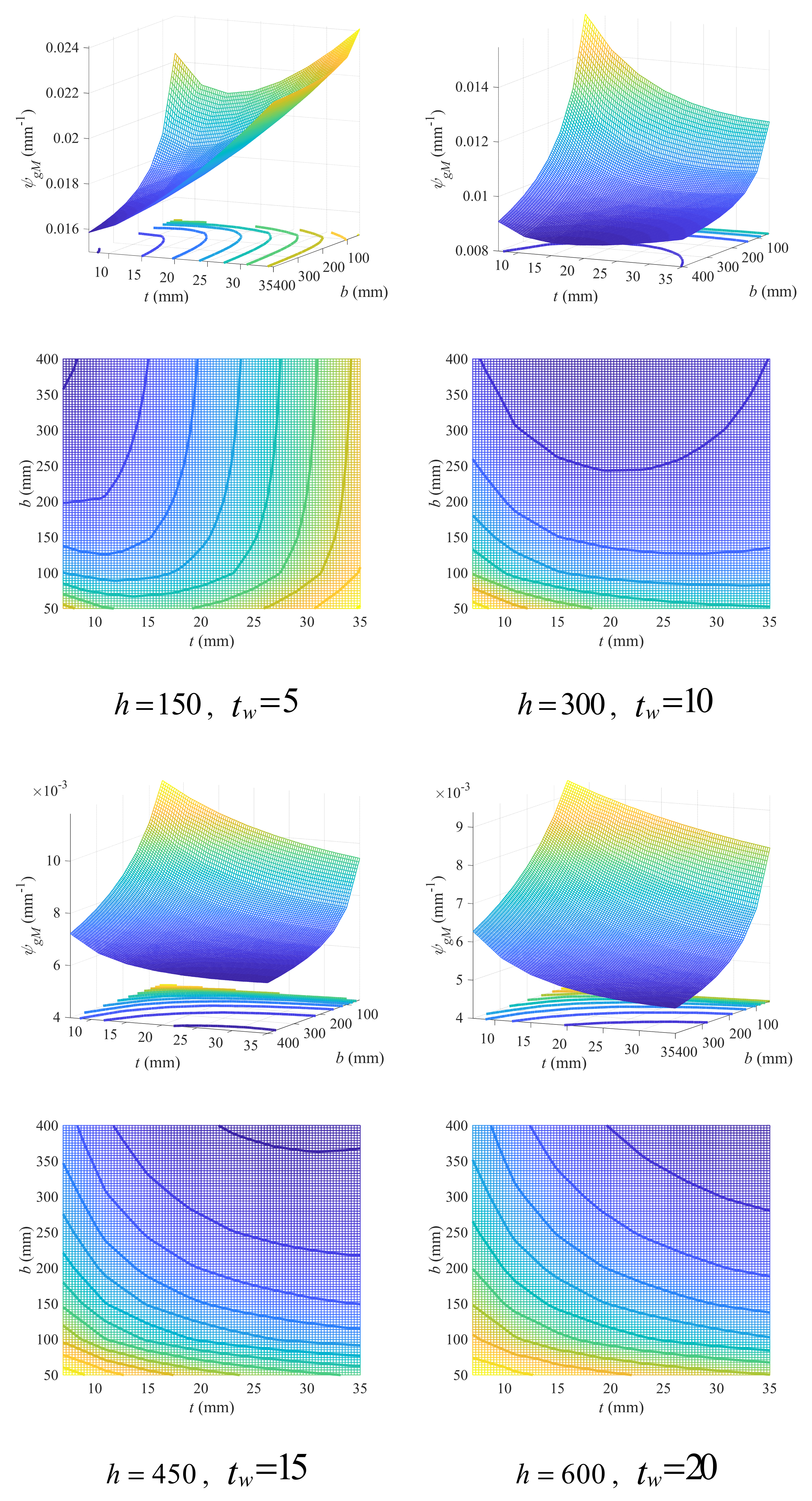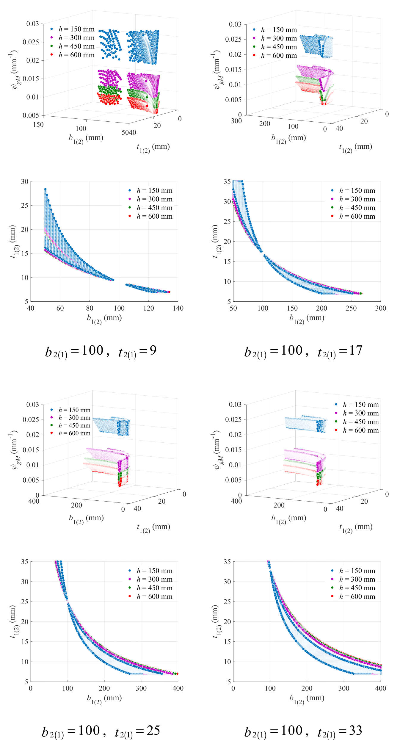 - If there is , then the relation of can be derived from Equation (12). That is, the cross-section has reduced to be double-symmetric with only four independent variables including the width () and thickness () of the flange, the height of the beam (), as well as the thickness of the web (), as previously discussed.