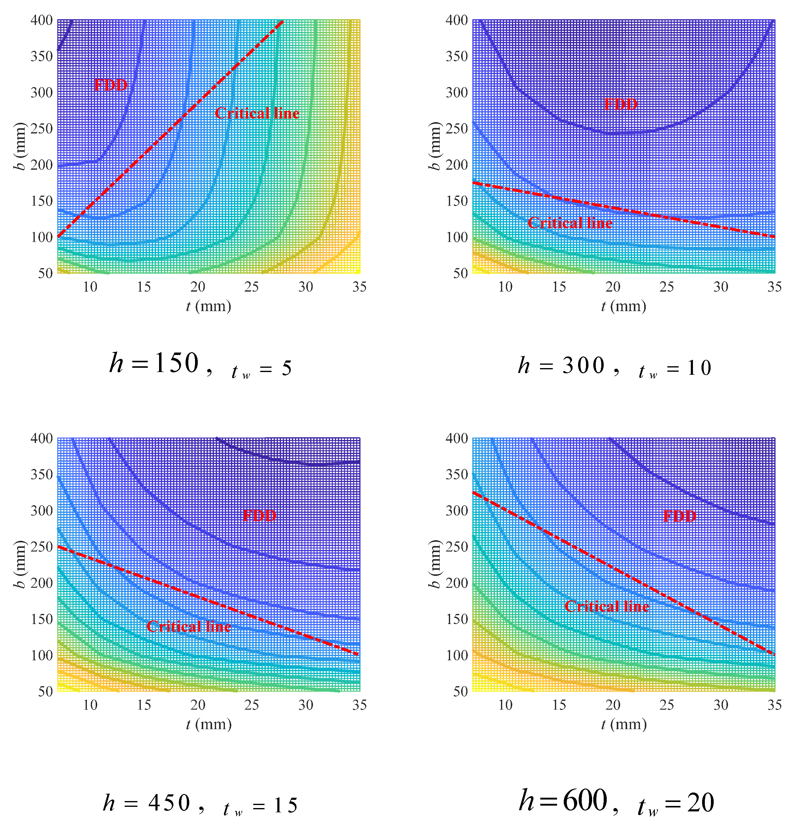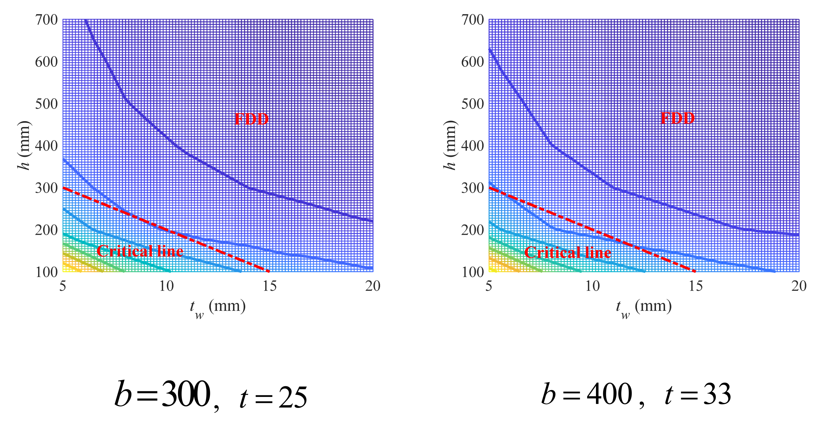 - For cross-sections bearing shear loads, increasing beam height and web thickness is beneficial, while increasing the width or thickness of either upper or lower flange is not a good choice. The FDD for upper (lower) flange width and thickness is affected by the thickness of lower (upper) flange, but the width of lower (upper) flange was found to have no obvious impact. The FDD for beam height and web thickness is not sensitive to the variation in flange variables. Both the FDD for upper (lower) flange width and thickness and the one for beam height and web thickness can be predicted through empirical linear design criteria with relatively high accuracy.