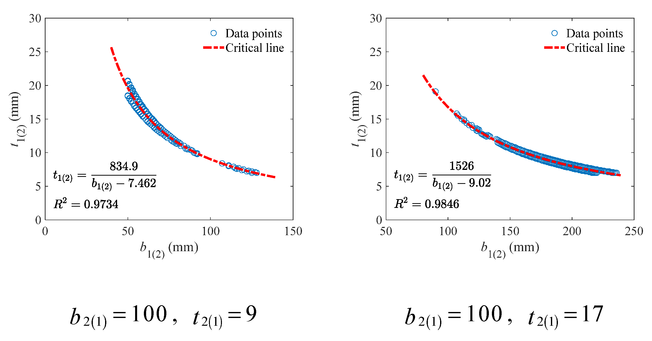 - If there is , then the relation as Equation (13) can be derived. The cross-section is still single-symmetric, but the number of independent variables has reduced from 6 to 5, including the width () and thickness () of the upper flange, the width () and thickness () of the lower flange, as well as the height of the beam ().
