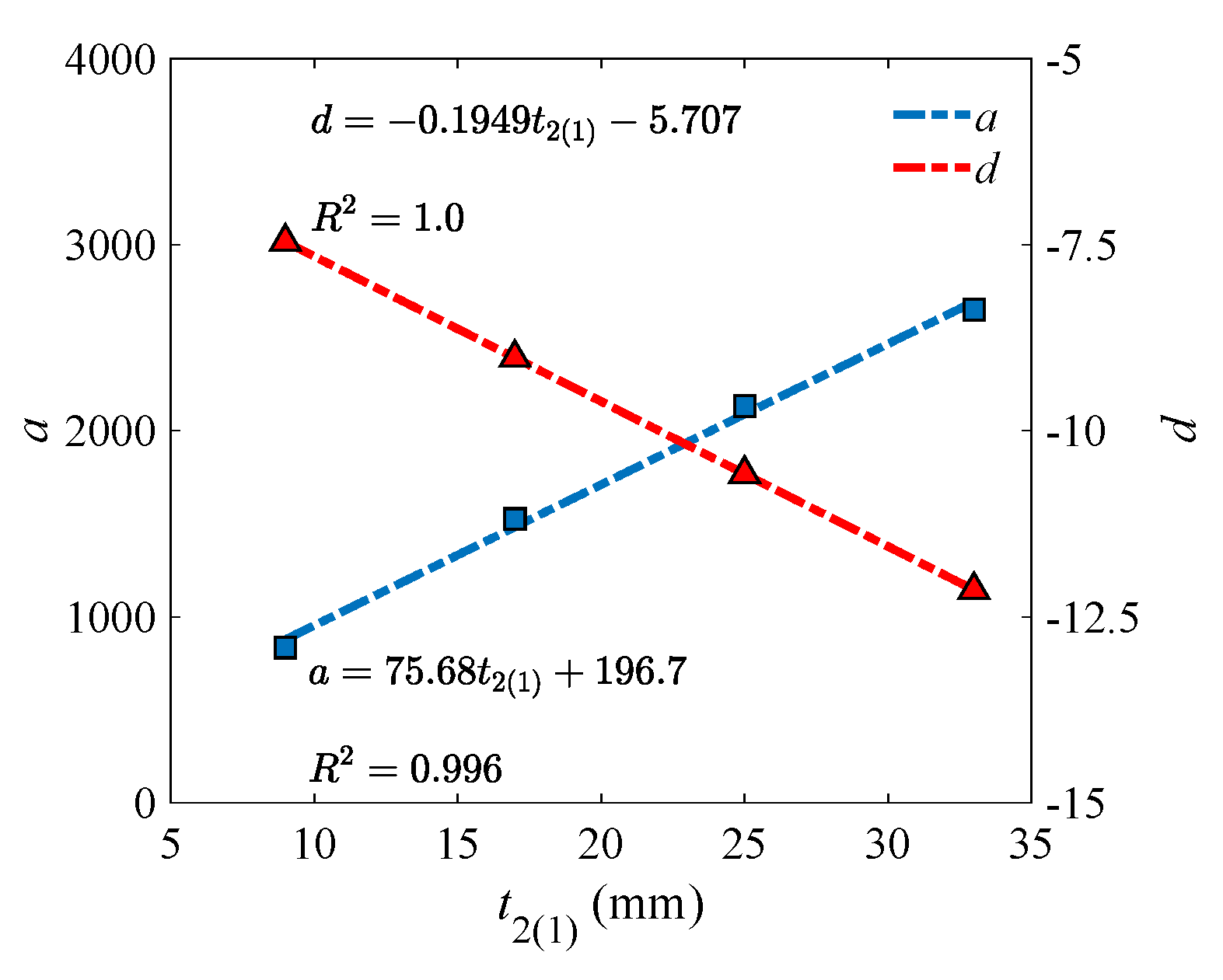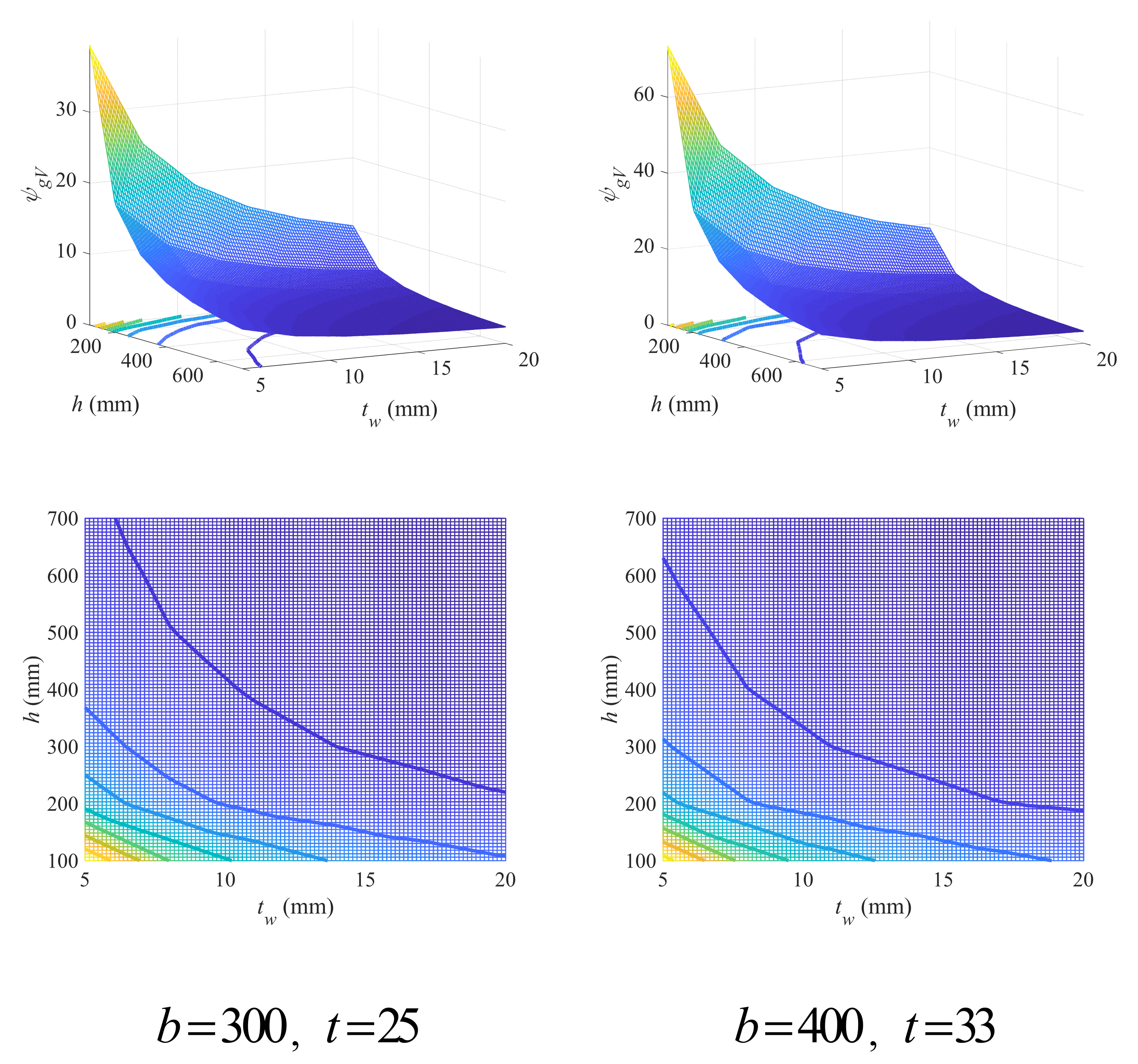 - For single-symmetric cross-sections bearing flexural loads, increasing beam height as well as flange width and thickness are all conducive to the low-carbon design, but using large beam height is the most effective. The FDD for upper (lower) flange width and thickness falls on the neighborhood of the critical line, which is mainly affected by lower (upper) flange width and thickness, while the influence of beam height is not that significant. The critical line can be well described using a hyperbolic model, with all model parameters showing strong linear correlations with both lower (upper) flange width and thickness.