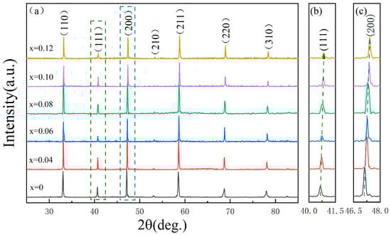 (a) XRD spectrum of BSNT-xCT ceramics, (b) the enlarged image of (111) diffraction peaks and (c) the enlarged image of (200) diffraction peaks.