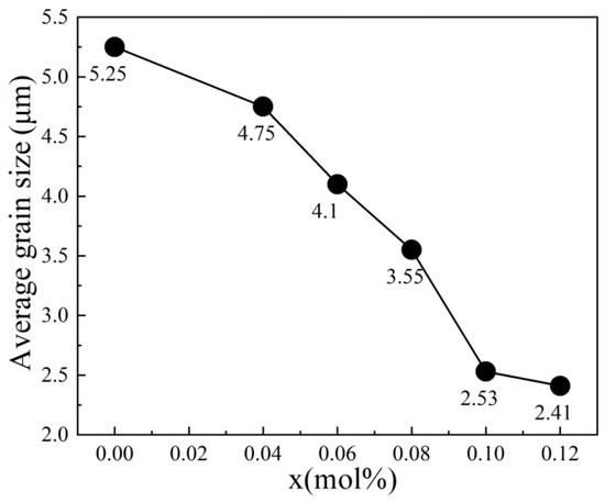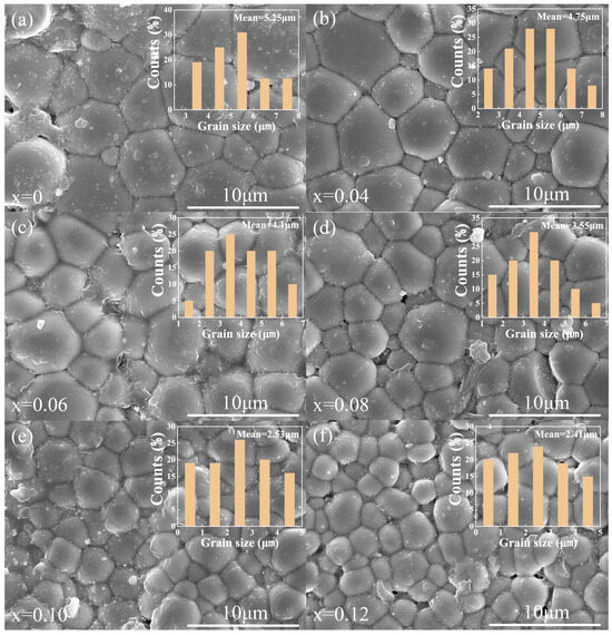 Figure 2a–f present the surface SEM images and grain distribution of each component of the BSNT-xCT ceramics. The images reveal that all the BSNT-xCT ceramic components exhibit dense sintering without evident pores or second phases. Additionally, statistical analysis presented in the inset demonstrates a consistent trend of decreasing grain size along with improved size uniformity. This phenomenon can be attributed to the increased structural stress induced by lattice distortion following component compositing, which effectively suppresses grain growth. Figure 3 illustrates the correlation between the average grain size (AGS) and varying CT contents. Therein, the AGS was determined by averaging the diameters of multiple grains, while the size of an individual grain was taken as its equivalent circular diameter. As the CT content increased, the AGS progressively diminished, which helped to create a relatively larger grain boundary proportion, thereby enhancing the breakdown electric field strength and consequently improving the energy storage capacity [10].