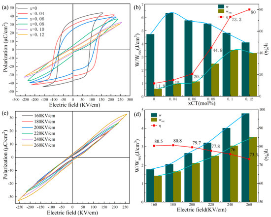 Different components of BSNT-xCT ceramics: (a) P-E curves and (b) W, Wrec, and ŋ, 0.9BSNT-0.1CT samples in different applied fields, (c) P-E curves, and (d) W, Wrec, and ŋ.