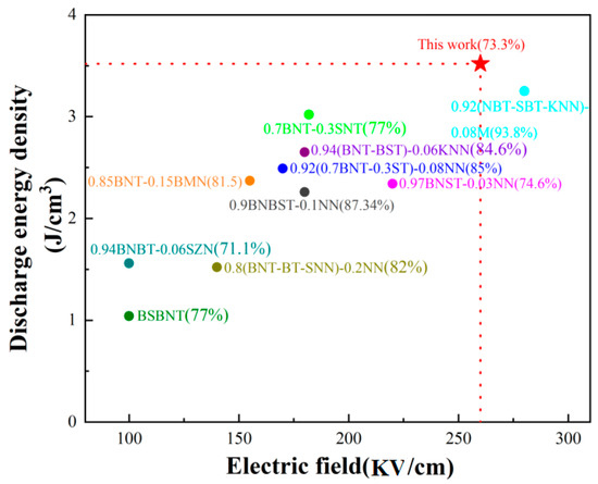 Figure 4a gives the bipolar P-E curves of BSNT-xCT samples under maximum breakdown field strength with a test frequency of 10 Hz, which clearly demonstrates that the addition of the CT component effectively reduced the ferroelectricity of BNST-based ceramics and enhanced the relaxation performance. When the CT content increased, the Pr decreased rapidly, whereas the Pmax of the ceramics containing 10 mol% CT reached a high of 32.80 μC/cm2. Larger Pmax and lower Pr are advantageous for enhancing energy storage capacity, as exemplified in Figure 4b [9]. This improvement can be attributed to the introduction of Ca2+, which reduces the cell volume, densifies the ceramic, and subsequently enhances Wrec and ŋ. The test data reveals that, for x = 0.1, the 0.9BSNT-0.1CT ceramic exhibits a Wrec valued at 3.52 J/cm3 and a ŋ of 73.3% under 260 kV/cm, which makes this ceramic stand out compared to most recent reports of the same ceramic systems as shown in Figure 5 [11,12,13,14,15,16,17,18].