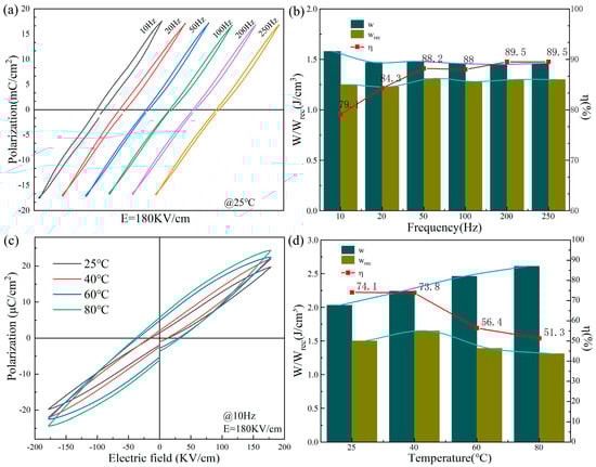 0.9BSNT-0.1CT samples: (a) P-E curves and (b) Wrec, W, and ŋ at 10–250 Hz, (c) P-E curves and (d) Wrec, W, and ŋ at 25–80 °C.