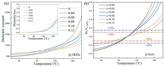 The εr and tanδ variation curves at different temperatures for BSNT-CT ceramics are presented in Figure 7a,b. Since the testing temperature was below the Curie point, the dielectric constant increased with rising temperatures due to enhanced ionic displacement polarization. Within the tested temperature range of 20–180 °C, all compositions exhibited broadened and flattened dielectric constant curves with pronounced frequency dispersion. Furthermore, the incorporation of CT content was observed to progressively suppress the dielectric constant. To quantitatively assess the impact of CT components on the dielectric characteristics of BSNT-xCT samples, Figure 7a gives the variation curves of εr and tanδ at different temperatures for BSNT-xCT ceramics. As the temperature changes from 20 °C to 120 °C, the ceramic dielectric constant (εr) curves of different compositions maintain parallel alignment with similar variation trends, exhibiting a mutual deviation Δεr/εr,x=0 < ±15%. Meanwhile, the dielectric loss tanδ remains below 0.35, indicating a low level. Figure 7b displays the test data collected at 1 kHz as a sample, using εr at 100 °C as the reference. The variation curve of Δεr/εr,100°C with temperature is observed. Calculations reveal that as the CT content increases, the temperature range where Δεr/εr,100°C < ±10% gradually widens, shifting from 83 to 112 °C at x = 0 to 63.7–132.7 °C at x = 0.12. This suggests that the solid solution, when synthesized effectively, enhances the dielectric temperature stability [20].