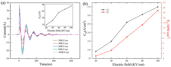 0.9BSNT-0.1CT ceramics: (a) underdamped discharge waveforms under various electric fields, inserted as Imax; (b) relationship between CD and PD and field strength.