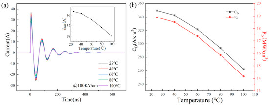 To verify the capacitor performance, the charge and discharge performance also needs to be tested. Figure 8a illustrates the waveform curves of current versus time for underdamped discharge of 0.9BSNT-0.1CT ceramics under various applied fields. The curves at varying voltages tend towards zero after a few cycles, and the increasing current peak from 9.7 A to 37.3 A is directly proportional to the external electric field. Figure 8b calculates the current density CD (CD = Imax/S) and power density PD (PD = ImaxE/2S), where S is the area of the electrode used for testing. The line graph demonstrates that both CD and PD increase as E increases. The Imax of 37.3A is achieved at a maximum of 100 kV/cm, with a CD of 349.58 A/cm2 and a PD of 18.90 MW/cm3. Figure 9a,b show the underdamped discharge waveforms for temperature variations (25–100 °C). Between 25 °C and 60 °C, Imax, CD, and PD exhibit good stability with less than 10% change. However, as the temperature exceeds 60 °C, there is an increase in decay, which may be attributed to the rise in sample resistance at higher temperatures.