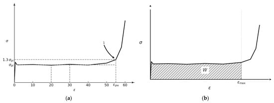 where is the stress at strain , is the strain limit and is the mass of the body. It may also be interpreted as the area under the stress–strain curve up to the strain limit as shown in Figure 1b. The ISO standard defines this strain limit as 50% or 1.3× the plateau strain. For the current study, the 50% strain limit and a strain rate of 37.5 s−1 is considered.