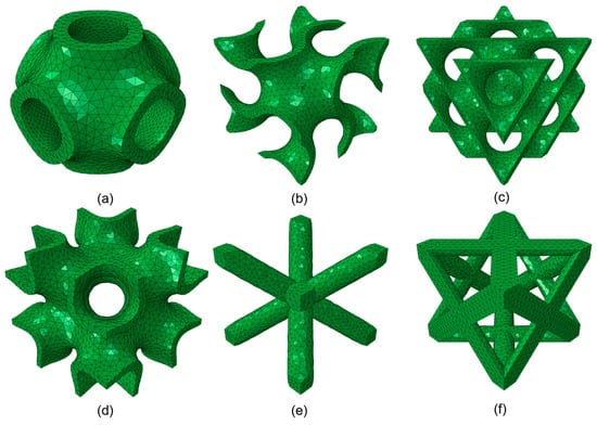 The TPMS geometrical properties, such as RUC size, nominal thickness, and nominal relative density, were parameterized, respectively, and their raw stereolithography (STL) format was created using their implicit functions and parameters. The shell of the body-centered cubic RUC was generated by the CAD software Autodesk Fusion (https://www.autodesk.com/products/fusion-360/overview). The finite element software ABAQUS/CAE 2023 was used for the FE simulations. The STL models were imported into ABAQUS and converted to CAD using virtual topology to create the full FE model. The unstructured and pre-generated mesh was deleted, and the shells were remeshed accordingly using the values obtained from the mesh convergence study, which is discussed briefly in Section 3.1. The mesh was corrected on all boundary surfaces to achieve periodicity for periodic boundary conditions. Finally, the mesh elements were converted to C3D10 solid elements in quadratic order. The chosen unit cells have a bounding box dimension of 5 mm, with a relative density of 20%, 30%, and 40%.
