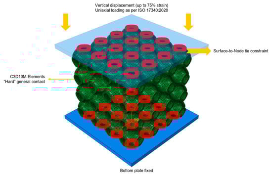 The energy absorption of bulk lattice structures was determined in a uniaxial compression test. The bottom side was fixed, while a displacement until 75% strain was applied to the top plate. A strain rate of 37.5 s−1 was chosen to simulate a maximum deceleration of 40 g on a standard impact attenuator prescribed in the FSAE regulations [36]. The resulting load–displacement data were collected to calculate stress–strain values. From these simulations, the absorbed energy was calculated as the area under the stress–strain curve. Figure 5 shows the applied boundary conditions on the RVE for energy absorption.