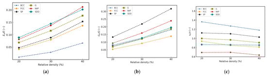 The normalized Young’s modulus of the lattice unit cells is shown in Figure 7a. Overall, it is apparent that the Young’s modulus increases exponentially and proportionally to the relative density of the lattices. TPMS lattice types outperformed strut-based lattices in terms of resisting uniaxial strain, where BCC is the weakest across all values of density. The FCC roughly matches the weakest TPMS structure, which is the Primitive, in terms of Young’s modulus, while the gyroid consistently finds itself in the average. As the material becomes denser, IWP showed a rapid increase and surpassed the Diamond at a density of 40%, which shows the highest values among all other lattices at relative densities of 20% and 30%.