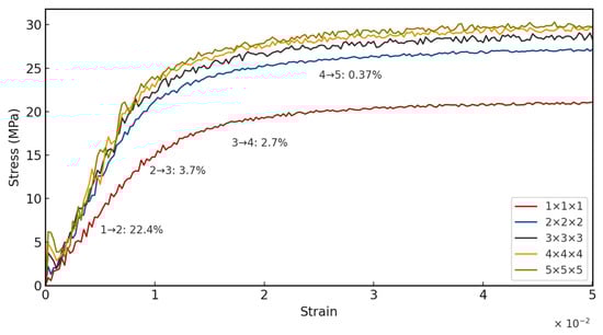 In periodic cellular material, it is a known phenomenon that effective properties change diminishingly as more RUCs are added. Beyond a certain point, the added cost of computation does not correspond to a significant increase in accuracy of the measured effective (homogenized) properties. This volume is known as the representative volume element (RVE). Therefore, a series of simulations, with varying bulk lattice sizes from to , under uniaxial compressive loading is performed. The stress–strain response for each is plotted, and the peak stress, as well as the Mean Percentage Error (MPE) of the stress–strain response, is measured.